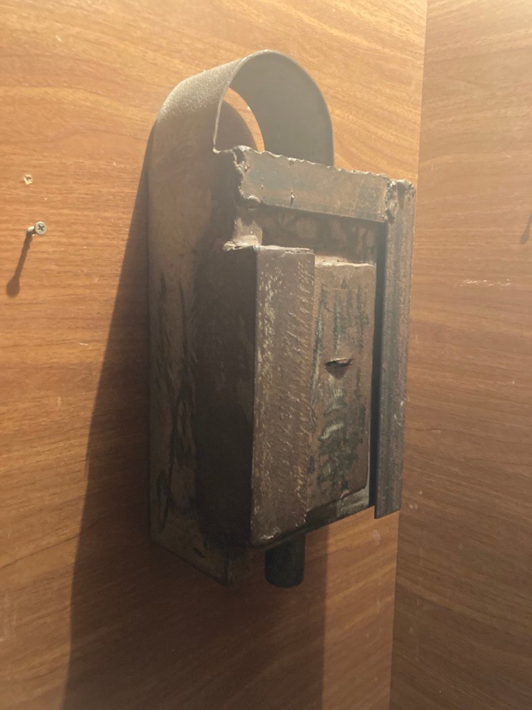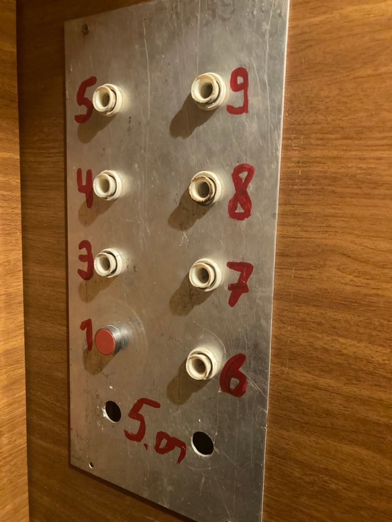 В лифте был прекрасный интерфейс в виде ящика для приема монет (лифты в старых домах работают от монеты в 10 тетри), в который не надо было кидать монеты, и кнопок с углублениями. Кстати, второго этажа среди кнопок нет, а лифтовые двери там перекрыты шваброй снаружи лифта